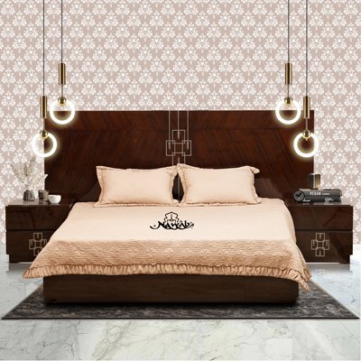 Wallnut Matt polish brass handles Leatherite upholstery laminated inside hydraulic bed Chanel pull out drawers