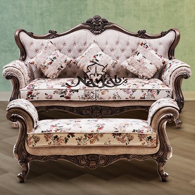 Teak wood victorian carving sofa cotton floral fabric with cushions melamine polish